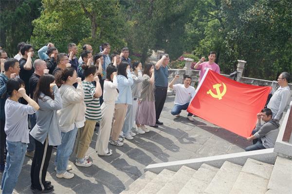 沿青石板拾級而上,在“革命烈士永垂不朽”的紀念碑前,大家駐足鞠躬、致敬先烈?!拔抑驹讣尤胫袊伯a黨……”面對鮮紅的黨旗,大家高舉右拳,重溫了入黨誓詞。